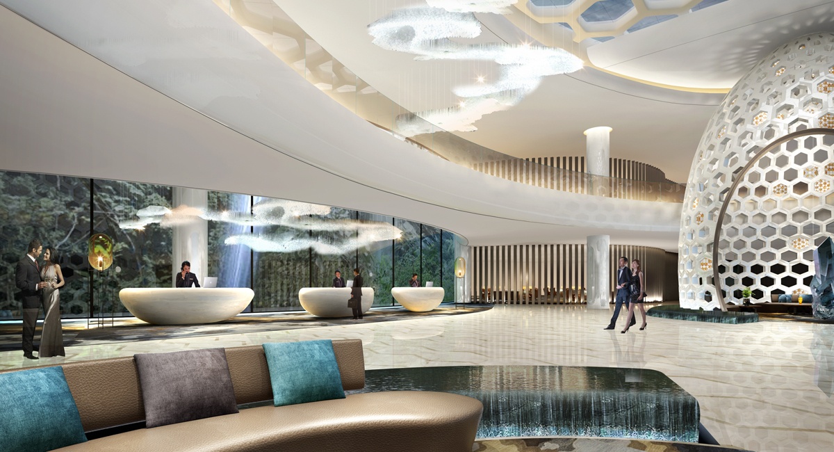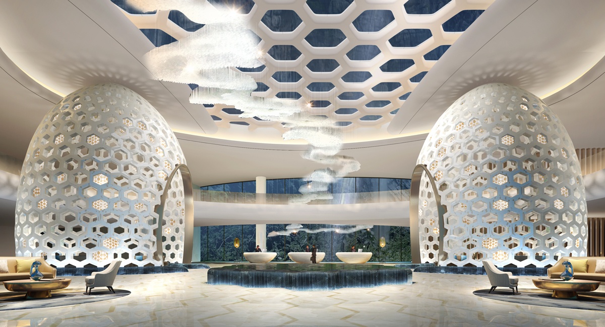 該酒店設計靈感來源于蜜蜂的智慧蜂巢,每個正六棱柱蜂巢的底,都是由三個全等的菱形拼成的,并且每個菱形的鈍角都等于109°28’,故該酒店設計取名為109°28’,意在表達設計師追求完美的理念。